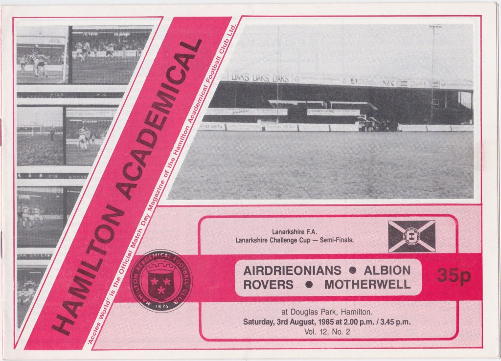 Accies began the 1985/86 season hosting the Lanarkshire Cup , playing Airdrie in the semi final. An early Airdrie goal was soon cancelled out and with new signings Jimmy Sinclair and striker Willie Jamieson making their debuts. Accies ran out 6-1 winners with Willie Jamieson netting a hat trick.