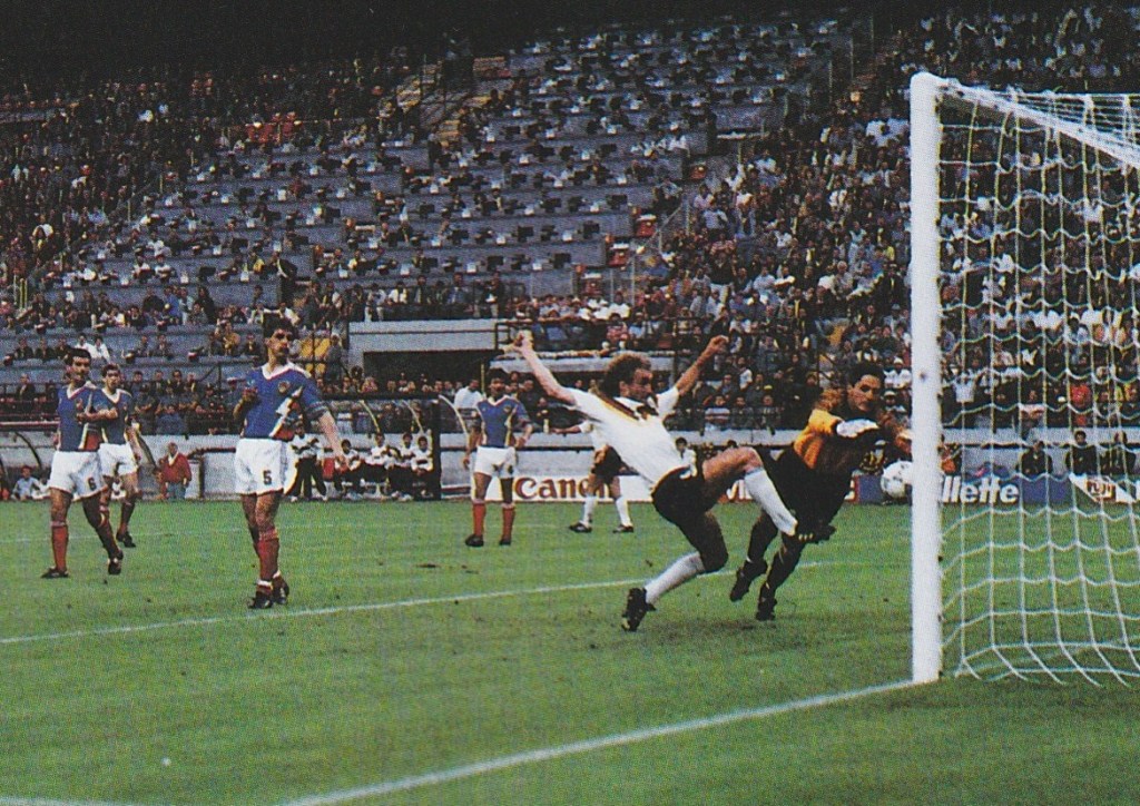 We travel by bus through France and it is as if France is shut , nobody to be seen , service stations closed to our buses until were are eventually allowed a lunch break. We make our ways across the Alps in Switzerland and stop in the evening and briefly see some football on a service station TV in Basle as Lother Matthaus scores the goal of the tournament