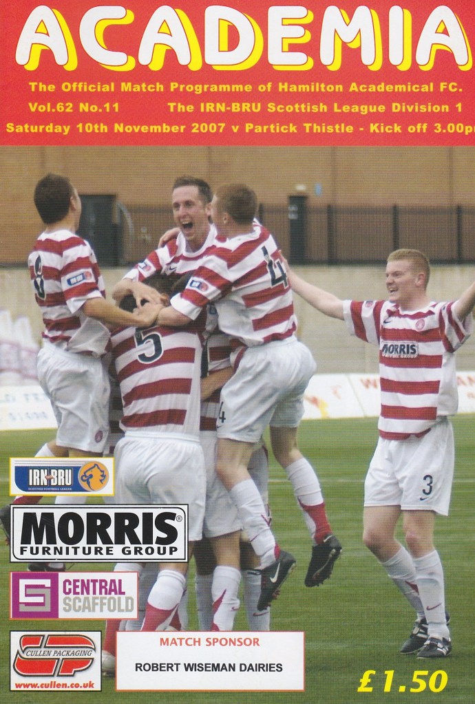 Accies returned to New Douglas Park to face Partick Thistle and opened the scoring with a great shot by Richard Offiong. Chris Swailes headed in from a corner after 77mins to give Accies a 2-0 win.